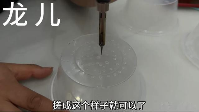 而且如果你不说的话,别人根本看不出这是一个一次性打包盒所做的。第二个妙用,我们把这个打包盒。倒立过来放在桌面上,现在用电烙铁在下面插上密密麻麻的小孔,戳的时候也不用戳的太大,密密麻麻的戳上一些小孔即可。